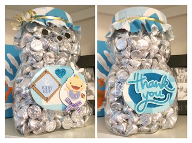 The typical candy guessing games I see online usually involve loads of the same candy (sometimes color coded for baby’s gender) in a clear container (large glass jar or a jumbo size plastic baby bottle bank). I thought I would try to craft something different this time. I sought out to find a container large enough to hold a good amount of candy and plastic so guests can pick up and inspect from all angles. Bingo! I found the perfect container in the shape of a bear at Target filled with animal cookies.