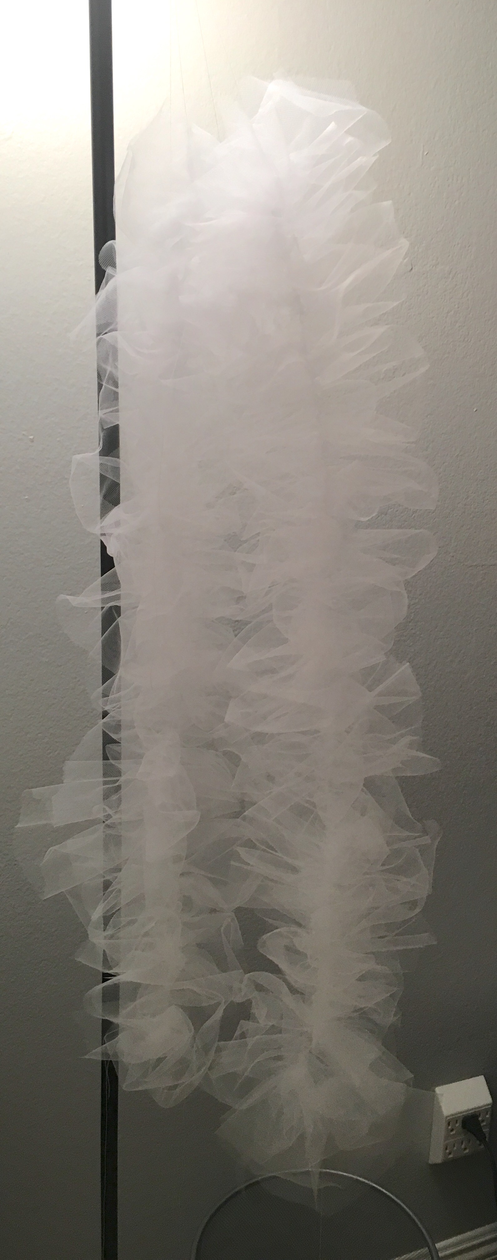 Next I basted 6″ strips of white tulle (1 yard long) and pulled the thread on both sides creating a ruffle. These are tied to the top near the pole. I’ve made 2 finished pieces: 2 yards each. I plan to make 2 more strands.