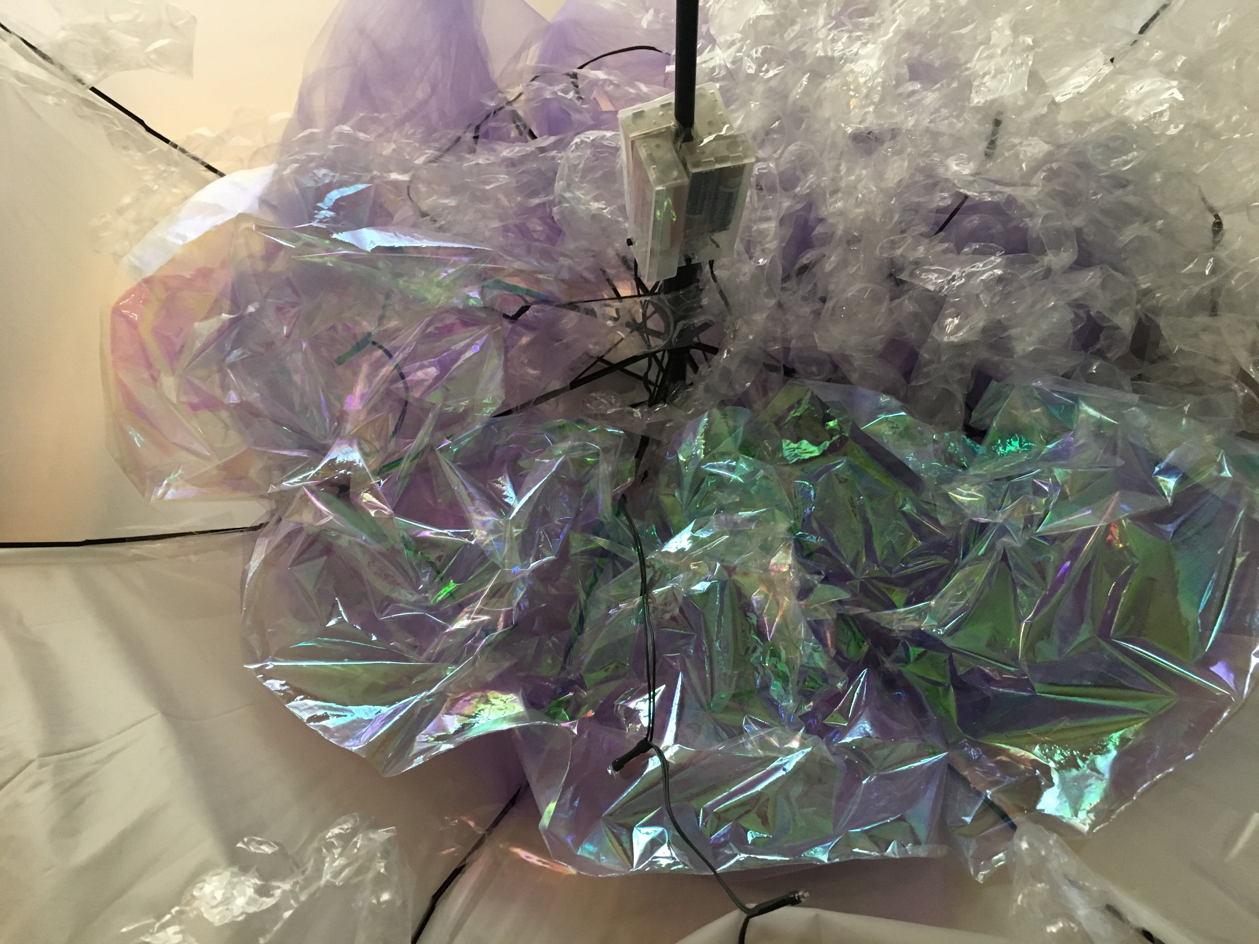 The umbrella was from the Daiso Japan store for $3. I bought 4 battery powered led lights from the dollar store. $4 iridescent celephane roll. $3 jumbo bubble wrap. And I used a yard of purple and white tulle I already had in my stash.