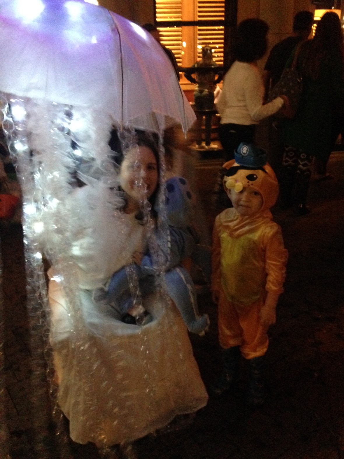 I wanted to create a super easy DIY jellyfish costume to go with their theme. Umbrella, tulle, lights and bubble wrap.