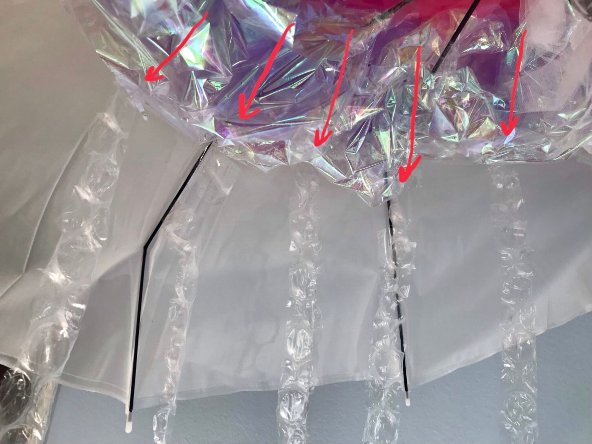 At first I bent the umbrella spokes downward to give it more of a dome and I did it too much and it looks kind of wonky BUT this caused the material in between to flap in the wind give it more of an organic, jellyfish feel.