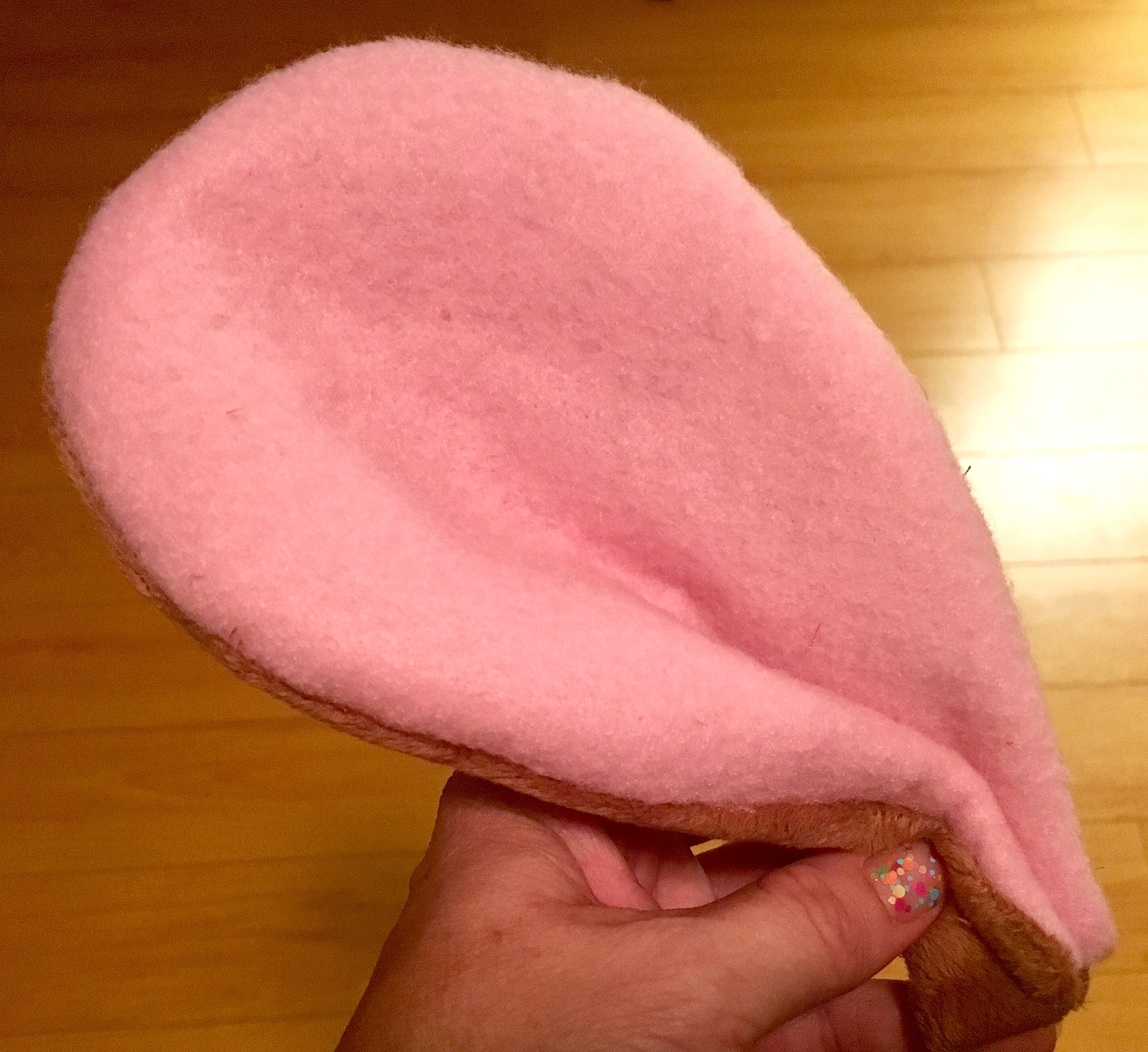 Ears: I had no idea what size the ears would be. Since I only had 2 pink felt sheets and I need a double layer because they were so thin, I just cut the 2 sheets in half and cut a tear drop as big as I could fit. Then cut the same size in minky fabric. Sew right sides together and turn out.