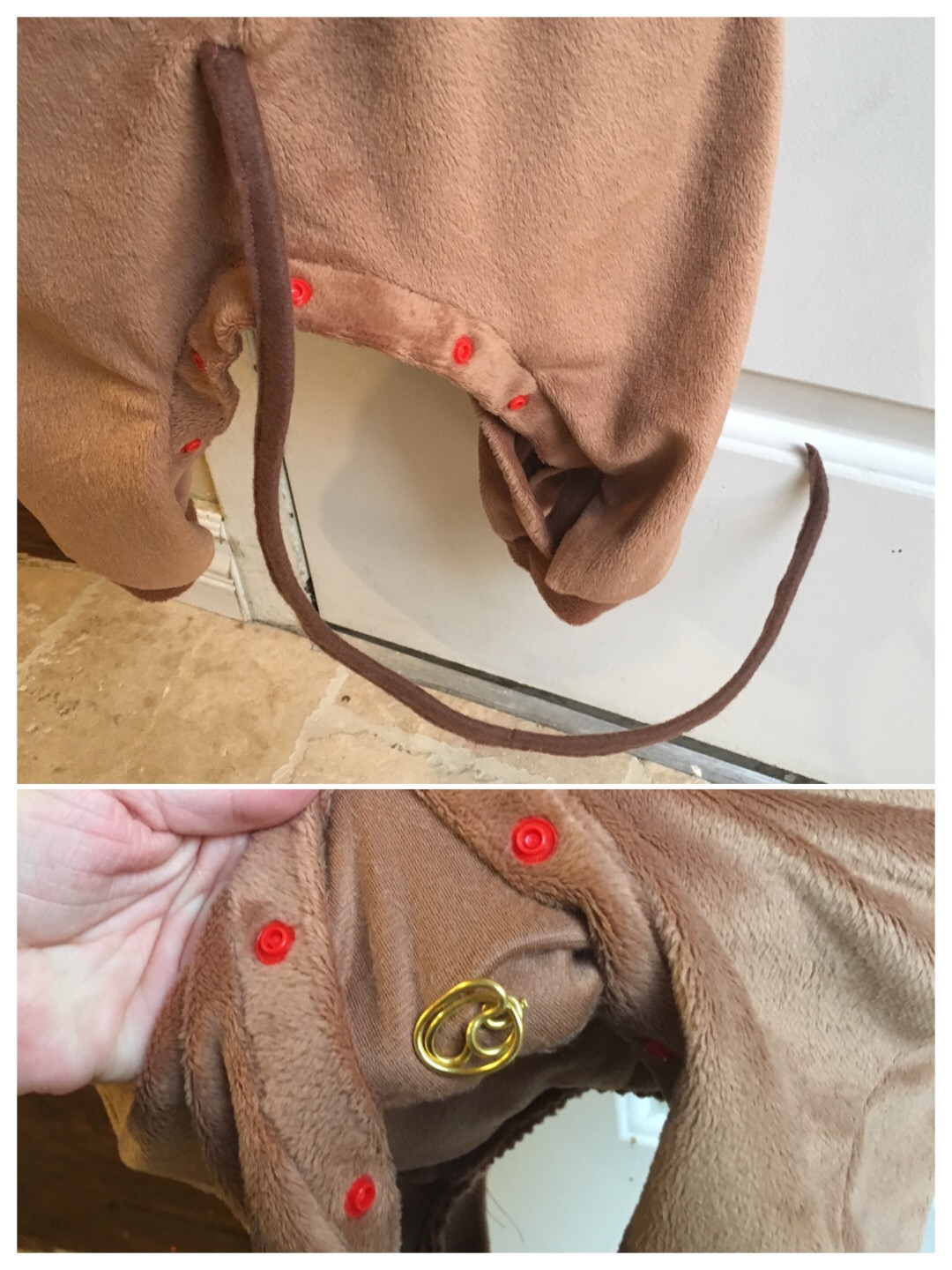 I had to hack the hoodie because it was too open. I sewed a 1/2″ casing along the rim, cut to holes on either side near neck line and fed a brown 1/2 satin ribbon through with a safety pin for a quick fitted hood. It will be tied in a bow and tucked in so it doesn’t show.