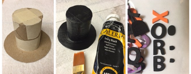 For the hat I used half a toilet paper roll, 2 circle cut outs of recycled cereal box cardboard and assembled with drafting tape. Painted the hat with black acrylic paint.