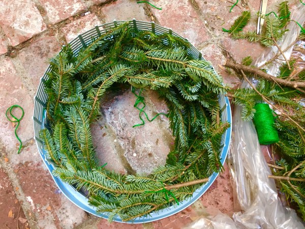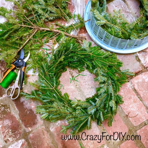 I cut the laundry basket in half and used the larger piece to create this wreath. Laying each large branch first to create a sturdy circle. The lighter branches were placed on top where I was happy with the even-ness. Then I cut (20) 3” pieces of jute twine to tie the branches together. Making sure the green twine wasn’t showing.