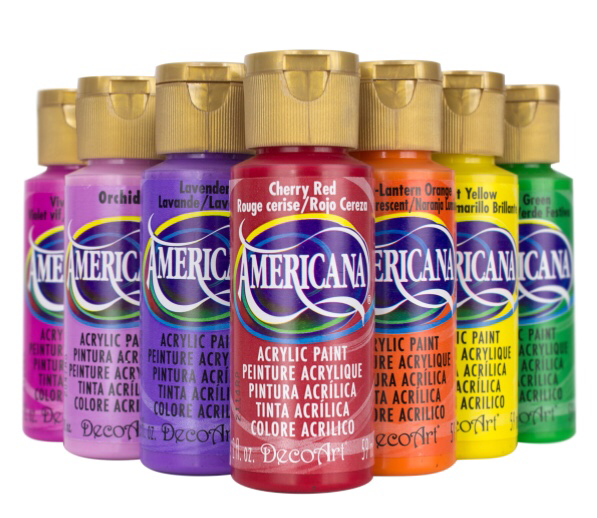 Here are the DecoArt Americana paints I used as well as some white to mix the bright colors into more pastels to match the room. I painted these with medium and large sponge brushes.