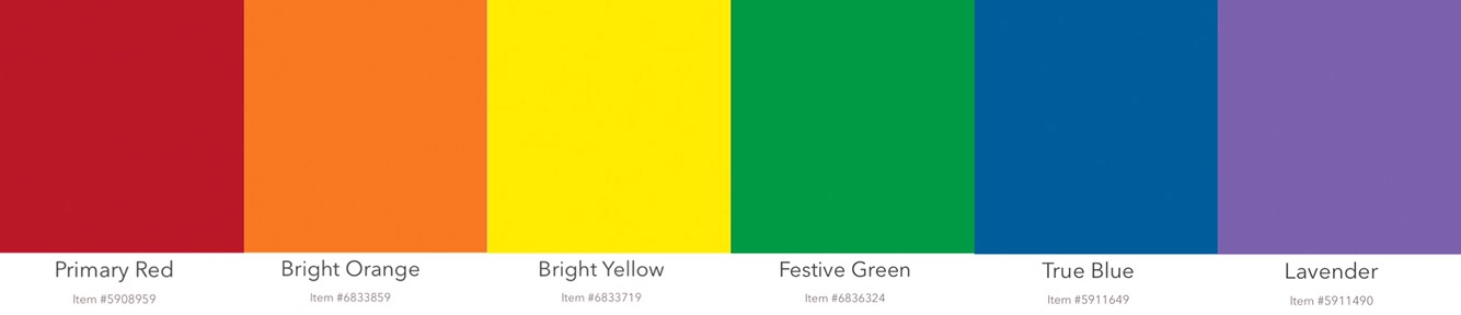 Bright Red, Bright Orange, Bright Yellow, Festive Green, True Blue and Lavender.