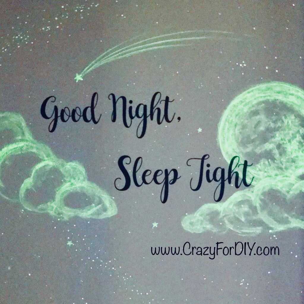 To paint with the glow in the dark paint I closed the curtains and plugged in a black light. Took about an hour starting with the moon, then the clouds, and then the stars. So fun!