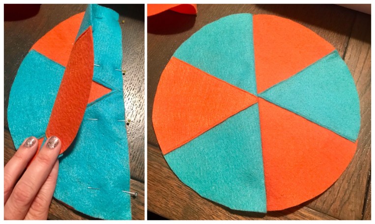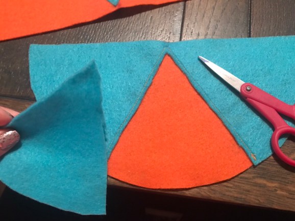 In order to get the alternating blue orange pattern on the top circle piece I had to do some piecing together. Since i had felt squares I didn’t have a big enough piece to fold and cut. I cut out 2 of the half circles (adding 1/4″ seam allowance on the flat edge): 1 orange and 1 blue. I cut a 1/3 piece of the alternative color for each half circle.