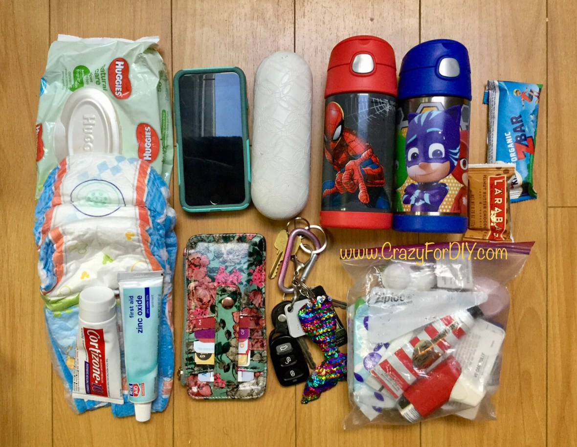 It’s actually pretty big inside with a zipper pocket and 2 small open pockets. I can fit all of this comfortably with room for extra. Diapers, wipes, cream, medicine bag, phone, wallet, glasses, water cups, snacks and keys. Not bad, right?
