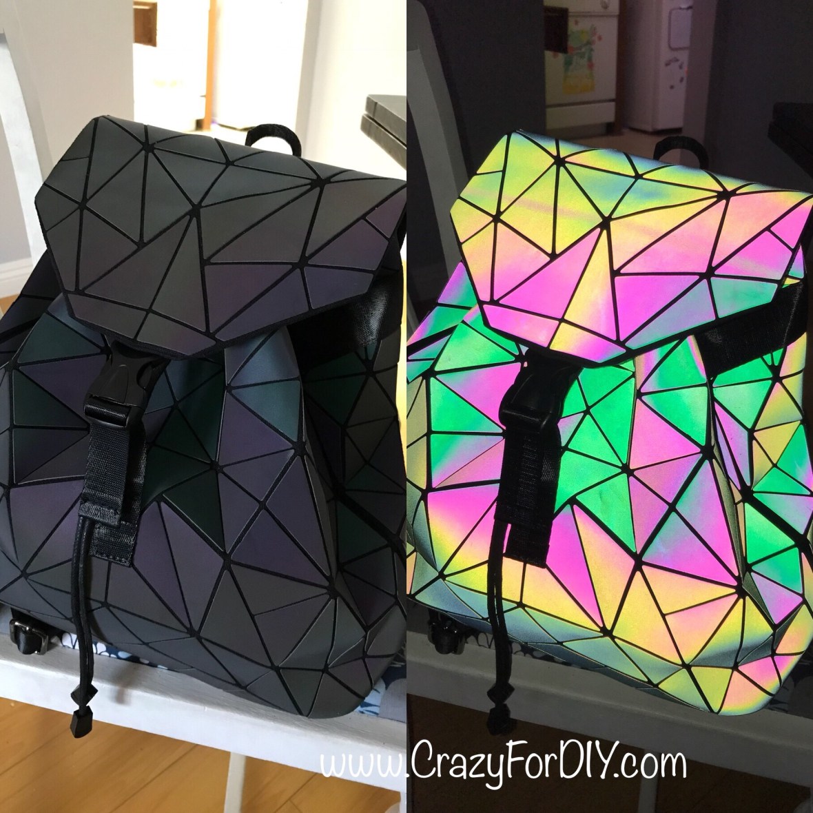 It’s normally black with a very light overlay of rainbow reflection but when hard light like a camera flash or the sun from certain angles shines on the material it glows super bright rainbow! This bag would be ideal for bike riding or walking at night like for trick or treating. This would be cute to add as an accessory to a costume too.