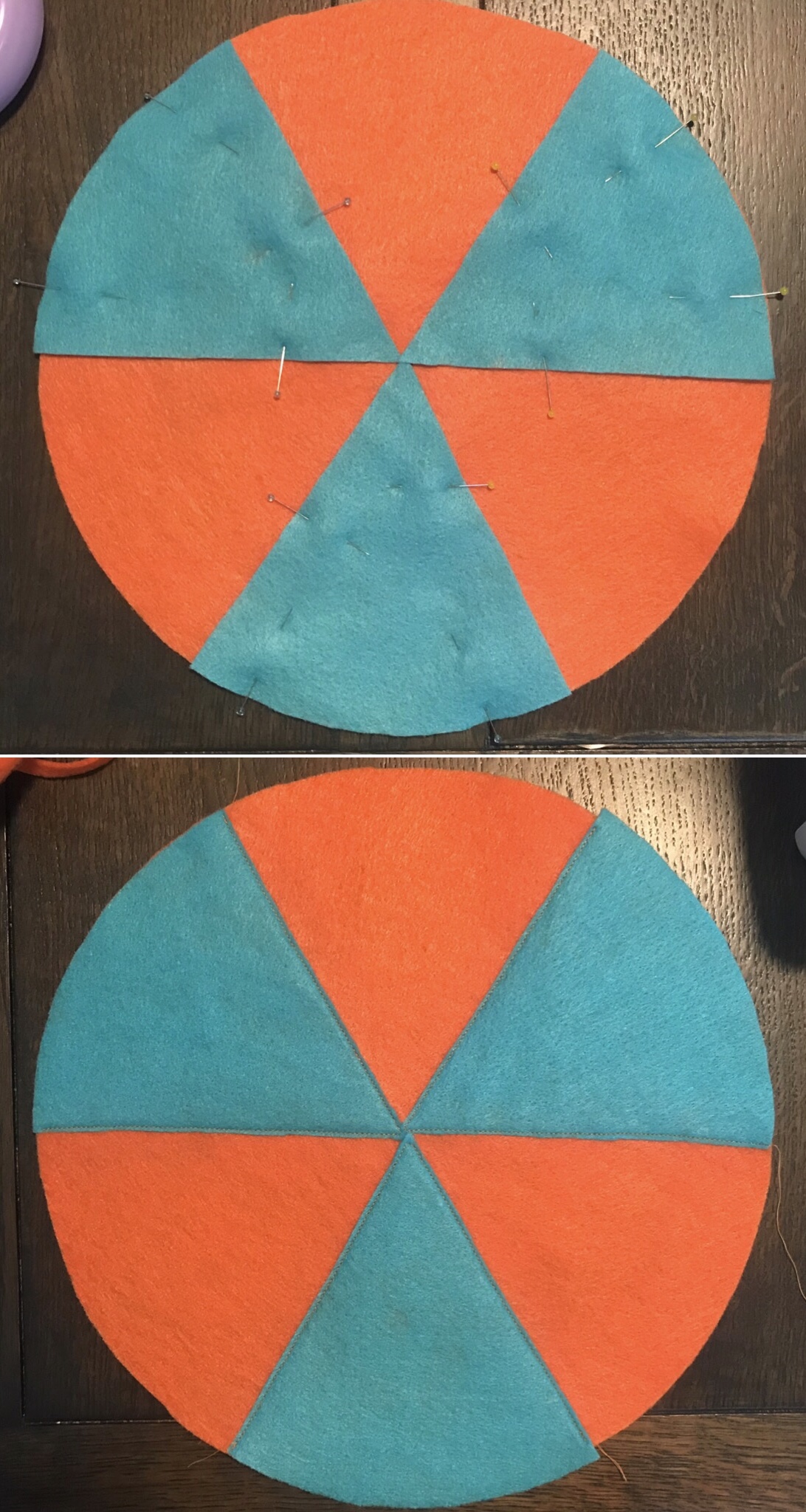 Pin teal pie-shaped pieces to orange top circle piece and top stitch on the blue pieces. I used orange thread to contrast with the teal.