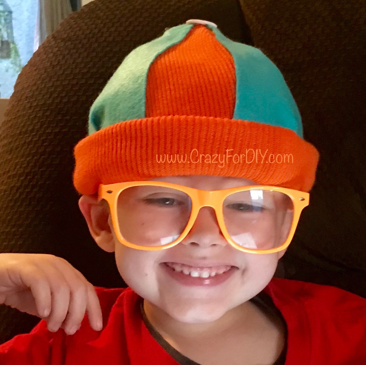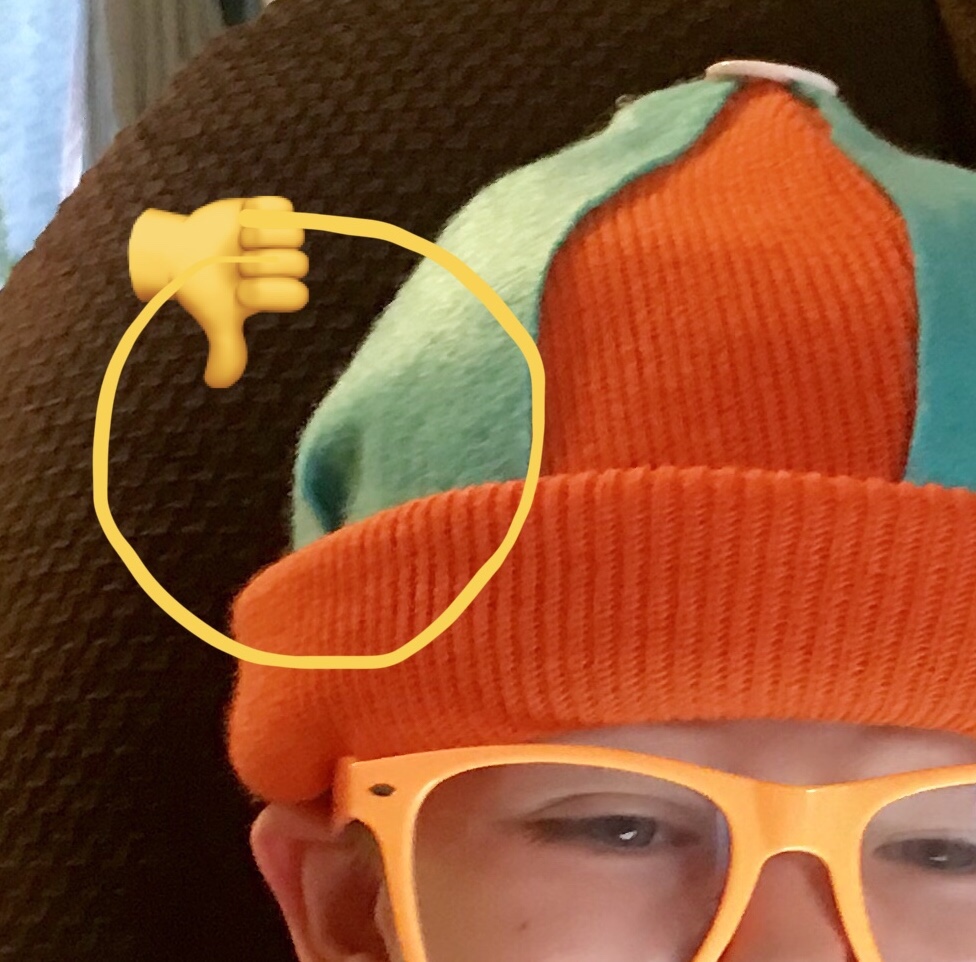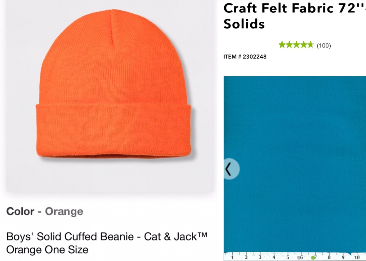 Another suggestion I would have for non-crafty or busy parents in a very tight bind for a Halloween Blippi hat is to buy an orange beanie like this Cat & Jack(TM) beanie at Target and hot glue gun 3 peacock felt pie-shaped cut outs on top. Good enough for one night and some quick pictures!