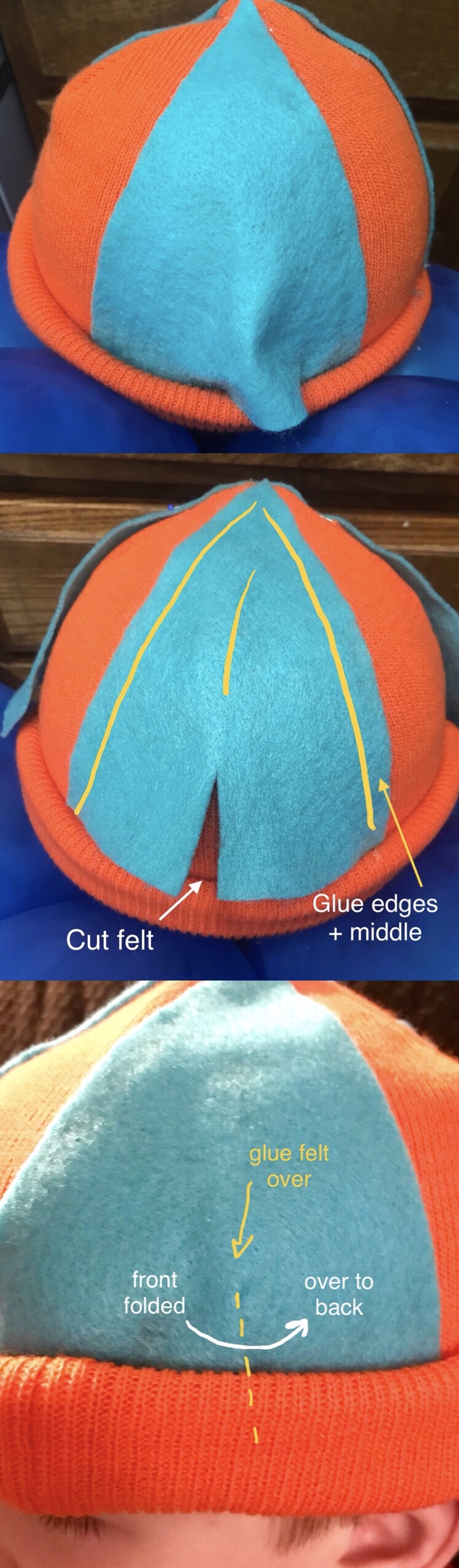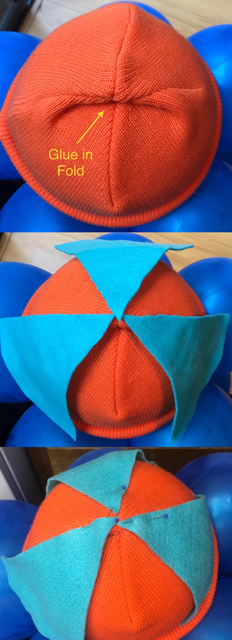 Before I started gluing the pieces I noticed, as with most beanie hats, there’s an excess of hat on top so I folded it over and hot glued it down.