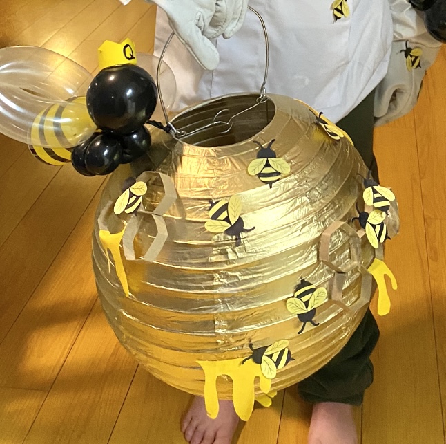 I think the bees are the accent that makes it a cool costume! I created a bee cutout template on my cricut and just quickly colored the bee details in with a sharpie. I made about 30 bees and stuck them onto the hat/jacket, gloves and lantern with double sided tape. When I made this lantern is we super last minute .. like the day before the school parade .. yay! #teamnosleep lol